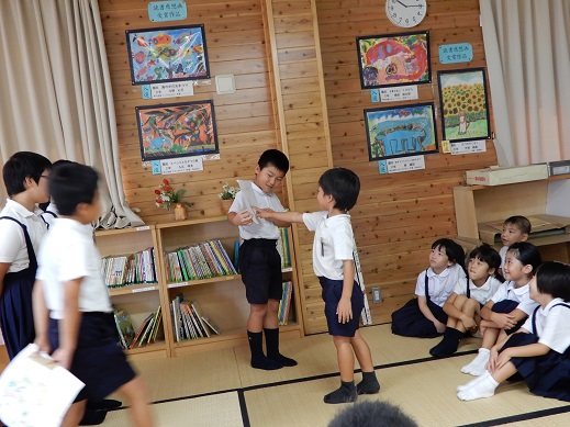 1年生に分かりやすく伝えることができるように練習をがんばった3年生。発表前はみんな緊張気味でしたが、発表が始まると、クイズや劇を取り入れ、1年生が楽しめる発表ができました。その日の昼休みは、1年生が3年教室に来て、筆で字を書いたり、楽器を触ったりしていました。