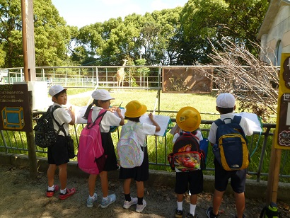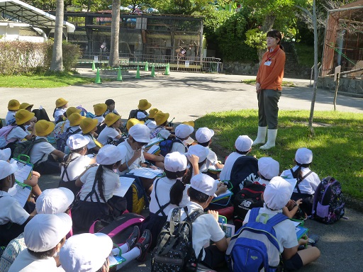 まず、獣医さんに話を伺うことができました。2年生は国語の学習で「どうぶつんのじゅうい」を学んだばかりでしたので、本物の獣医さんに、目を輝かせてたくさんの質問をしていました。その後は、縦割りグループに分かれて、動物の見学と観察に出かけました。2年生を中心に、協力しながらグループ行動ができました。