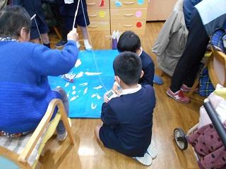 はじめに、子どもたちみんなで「パプリカ」を歌いました。その後、クイズ大会を行いました。最後に子どもたちが作ったゲームでお年寄りの方々と交流をしました。「福笑い」「すごろく」「的当て」「ボーリング」「魚釣り」の5つのゲームをお年寄りの方々がとても喜んでくださり、子どもたちも大喜びでした。