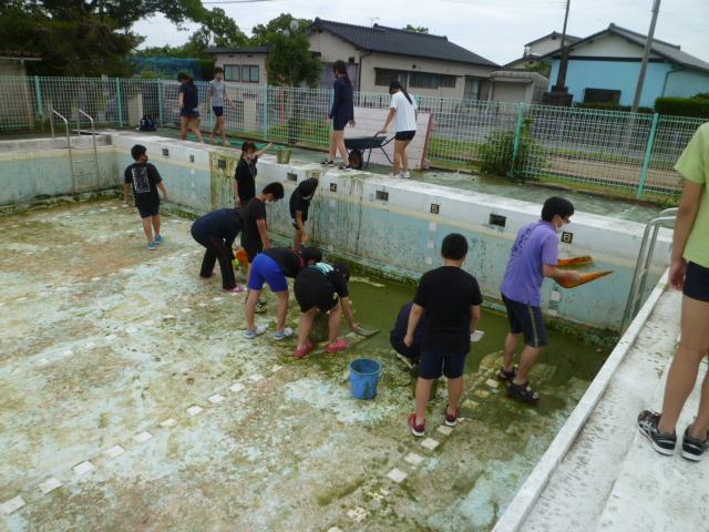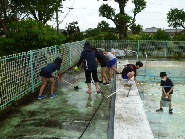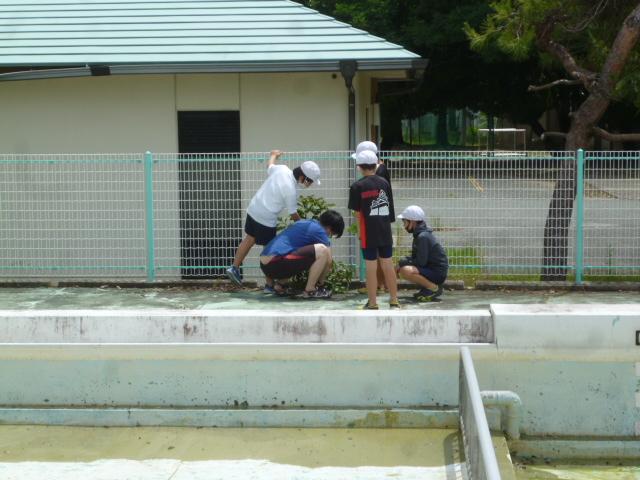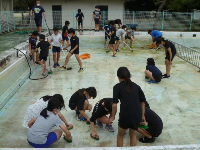 今回は密を避けるために、3・4時間目に4年生、5・6時間目に5・6年生がプール掃除をしました。プールの中やプールサイド、更衣室などに分かれ、みんな時間いっぱい掃除を頑張りました。その結果、プールがとてもきれいになりました。来週からの水泳の学習が、今からとても楽しみです。