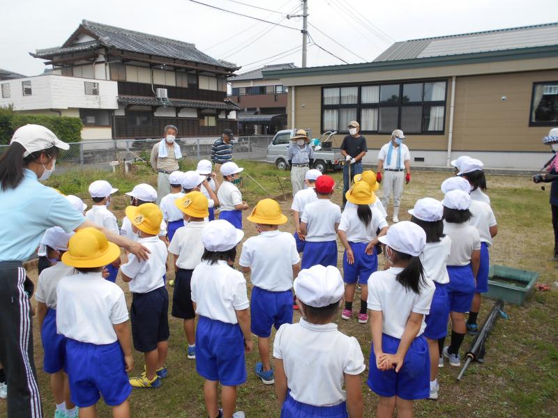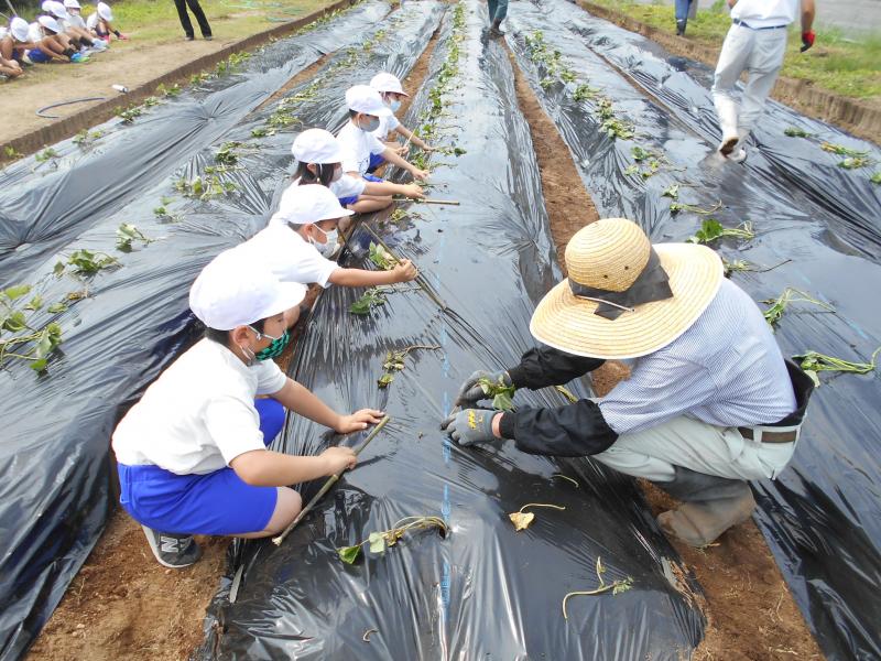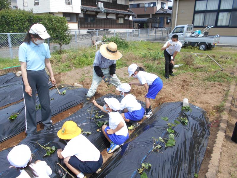 老人会の方々に教えていただき、みんないもの苗を植えることができました。2年生は昨年度もしていたので、みんなとても上手でした。1年生も初めて経験する児童が多かったですが、地域のおじいちゃん、おばあちゃんに教えてもらい、上手に植えることができました。
