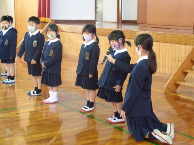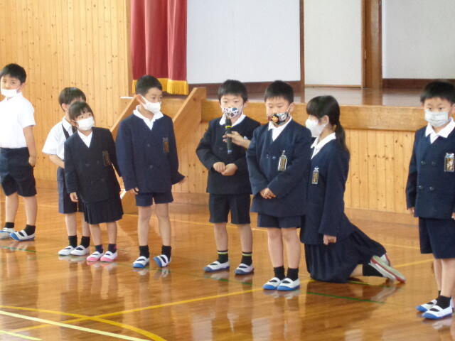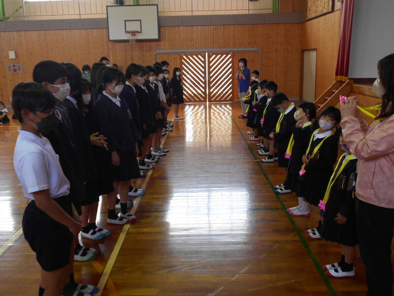 はじめに、10人の1年生が、一人一人自己紹介をしました。自分の名前と好きなものをみんな大きな声で言うことができました。その後、6年生が手作りのメダルをプレゼントしました。メダルをかけてもらい、1年生はとてもうれしそうでした。最後に、みんなでじゃんけん大会をしました。