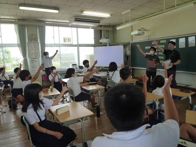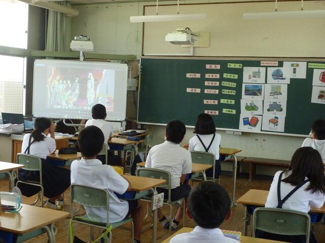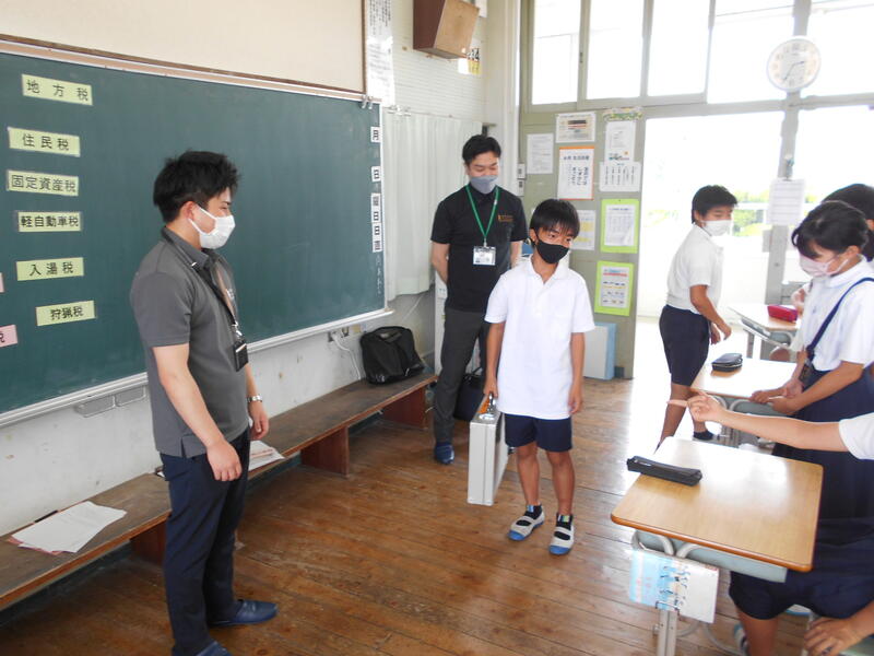 玉名市役所の税務課から二人の方に来ていただき、税金の種類や使い道などをDVD視聴やクイズなどで学習しました。子供たちは、たくさんの種類の税金があることや税金がいろいろなところで使われていることを知り、税についての興味・関心が高まりました。最後に、ケースに入った一億円のレプリカを一人一人が持ち上げ、その重さに驚いていました。とても貴重な経験をすることができました。