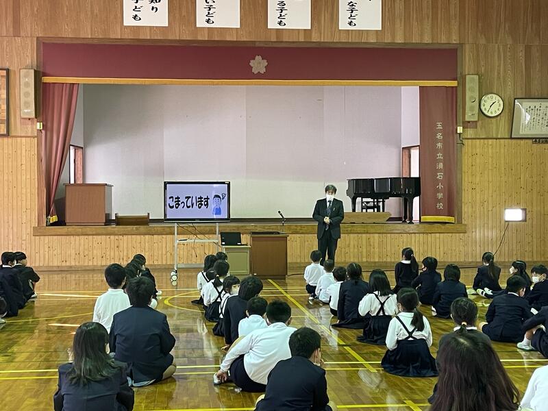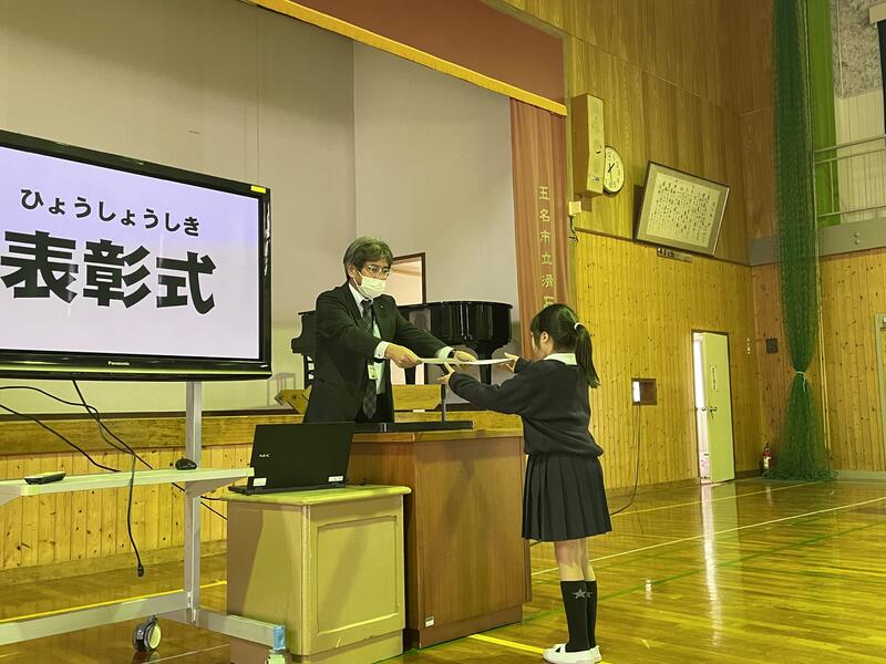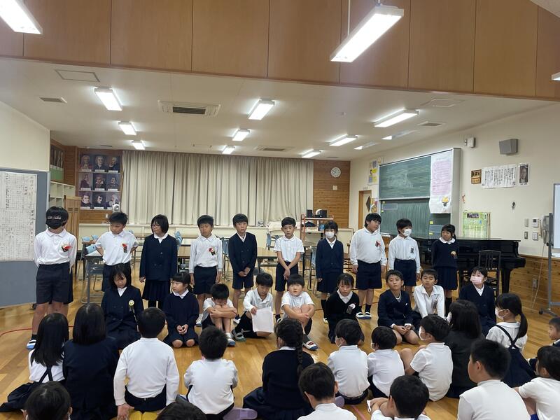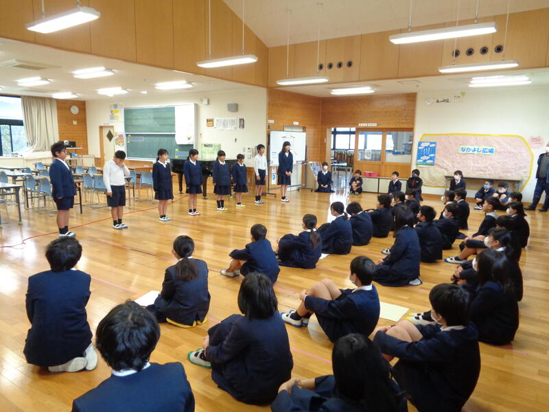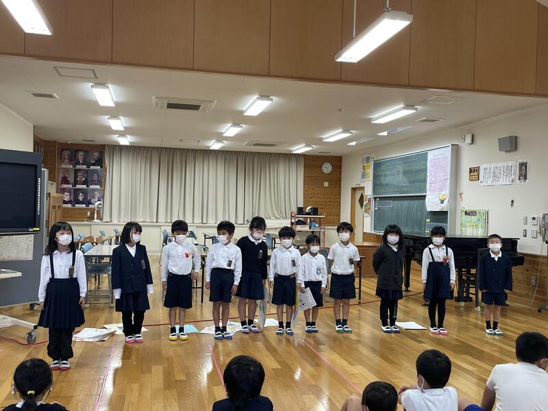今回の学校集会は、「表彰」と「校長先生の話」でした。表彰は習字、読書感想画、描画、版画で入選以上に選ばれた児童が名前を呼ばれ、代表の児童が校長先生から賞状を受け取りました。たくさんの子どもたちが名前を呼ばれていました。校長先生からは、ボランティアについて話がありました。「ボランティアは何のためにするのか」について、子どもたちは真剣に考えていました。これからも自分や周りのためにボランティアをがんばってほしいです。