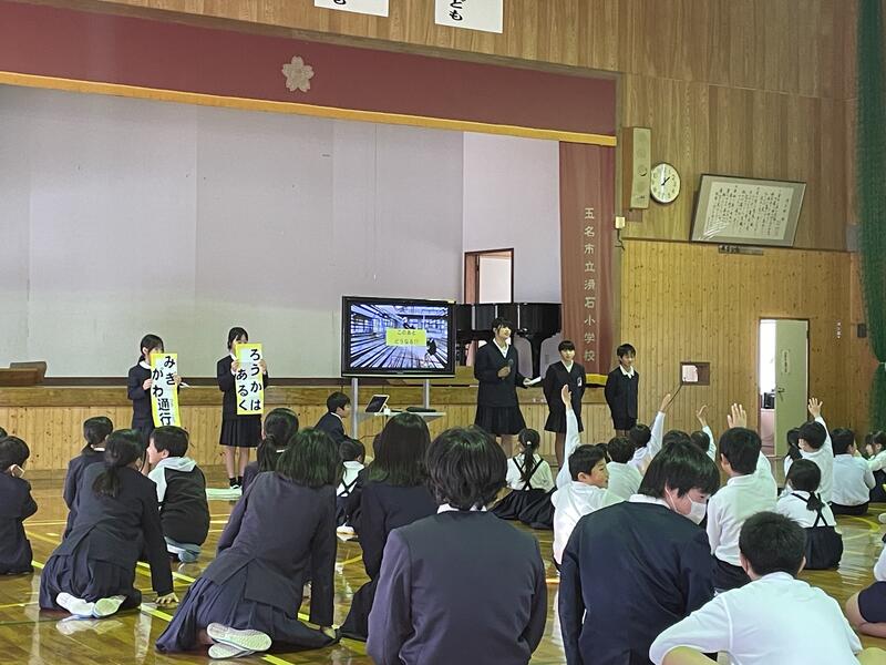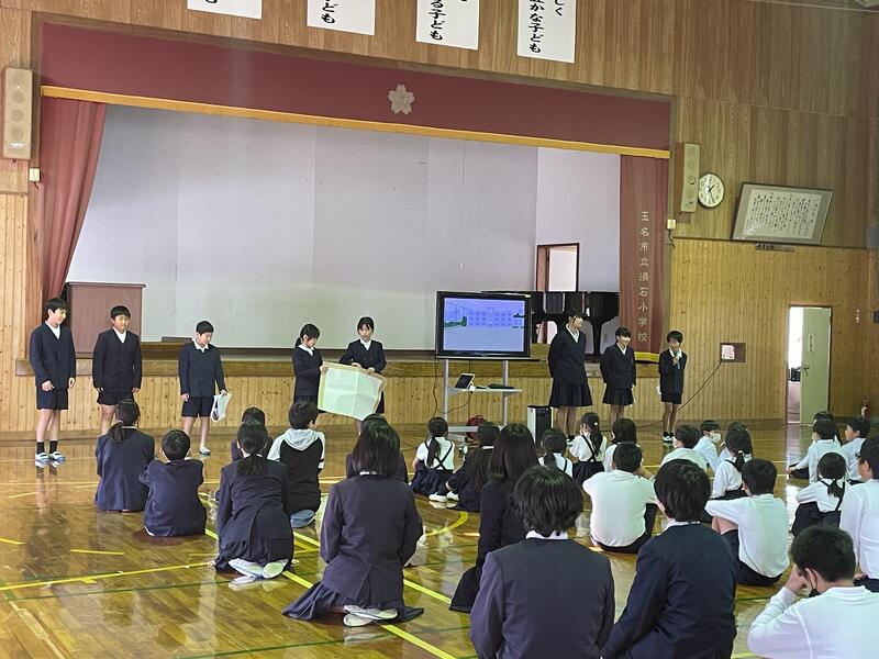 今回は、健康安全委員会からの発表でした。健康安全委員会は、「ろうかを走るとどのような危険があるのか。」「ブランコで遊んでいる人の近くを走るとどうなるか。」などの、学校生活に潜む危険性について発表しました。子どもたちの普段の様子を見ていますと、ついろうかを走ってしまう子どもがいます。今回の健康安全員会の発表で、ろうか歩行の大切さがわかったことと思います。これからは、落ち着いた生活を心がけ、大きなけがのない学校生活を送ってほしいです。