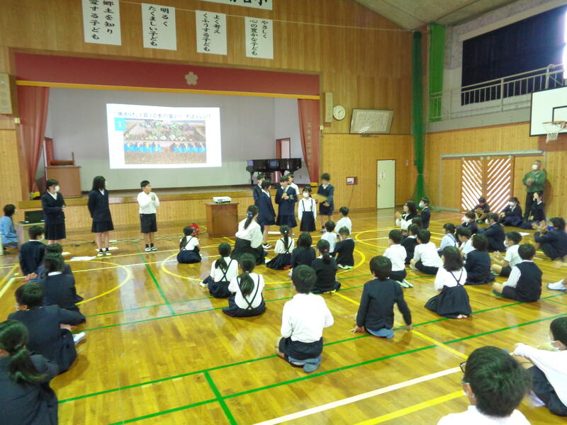 今回の児童集会は、環境委員会からの発表でした。環境委員会からは11月に行った「水かけ名人」の表彰と環境ISO宣言の確認がありました。集会の中で、各学年の水かけ名人に「どんな気持ちで水かけをしているか」のインタビューがありましたが、代表の子どもたちは「学校を花いっぱいにしたい」「きれいな花がさいてほしい」などの答えで、学校や植物のことを考えて水かけをしていることが分かりました。