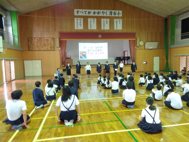 今年も低学年(1~3年)と高学年(4~6年)に分かれて、ホールでともだち集会を行いました。それぞれの学年で人権学習で学んだことをもとに発表をしました。低学年は「友達を大切にすること」「人の気持ちを考えること」などの大切さを、高学年は「正しく知ること」「自分の気持ちをしっかりと伝えること」「自分のこととして考えること」などの大切さを発表しました。どの学年も人権学習で学んだことや感じたことが伝わるすばらしい発表でした。今回のともだち集会を通して、滑石小81人の絆が、さらに深まったことと思います。