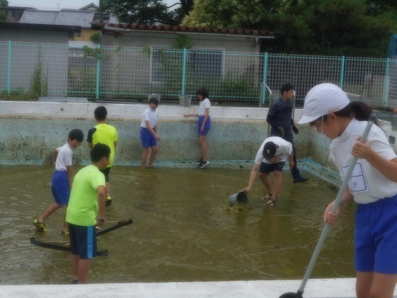 6月10日(月)、来週からの水泳授業に備え、4年生以上の39名でプール掃除を頑張りました。