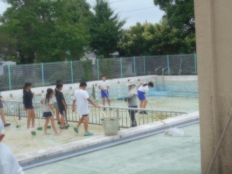 昨年までと比べ、プールの中で水を汲みだす6年生の人数が減っていることから、今回は保護者の皆様にも協力していただき、何とか時間内にピカピカのプールにすることができました。休みを返上してお手伝いいただいた4名の皆様、大変お世話になりました。