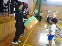 1年生との交流では、一緒にマツボックリのけん玉を作って遊びました。この日のために、マツボックリを拾いに行ったり、作り方を教える練習をしたり、準備をとても頑張っていました。はじめは緊張していましたが、仲良く、楽しく遊ぶことができて、大成功に終えました。