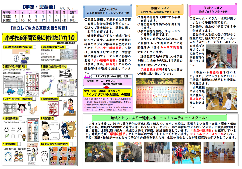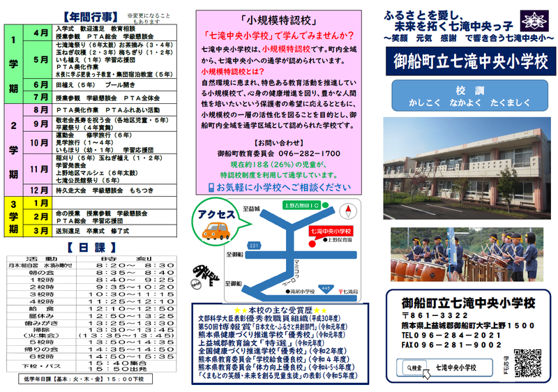 御船町立七滝中央小学校は、「地域とともにある学校」先進モデル校として、その果たす役割を十分に理解しながら日常的に教育活動に取り組んでいます。