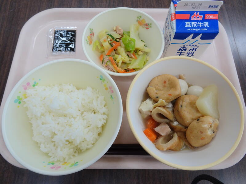 本日のお品書き:麦ごはん・おでん・野菜のナッツあえ・ひじきのり佃煮・牛乳