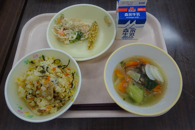 今日のメニュー :ひじきご飯、五目うどん、野菜のごまネーズあえ、牛乳