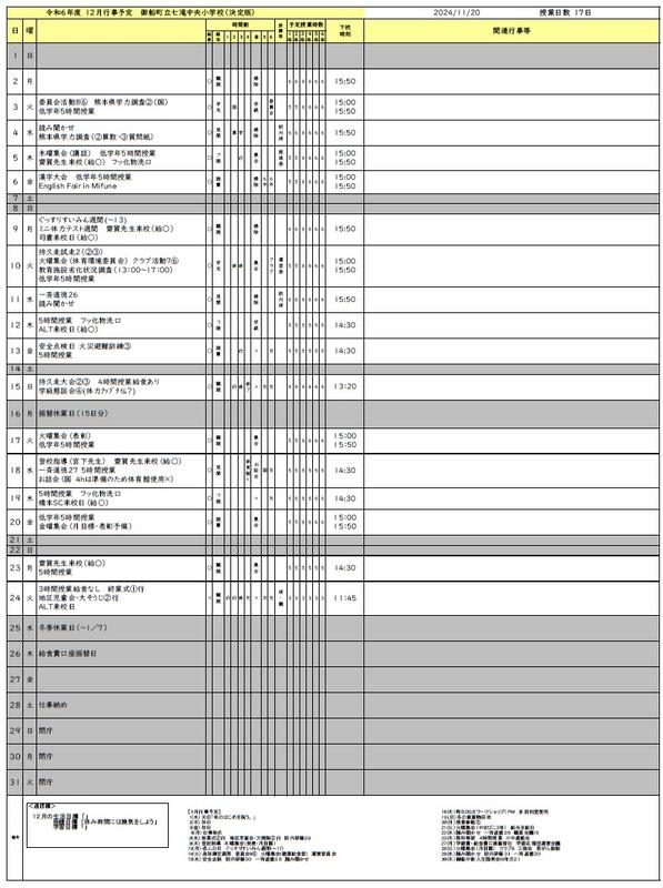 12月の行事予定表をアップしますが、正式な決定については週案をご確認ください。