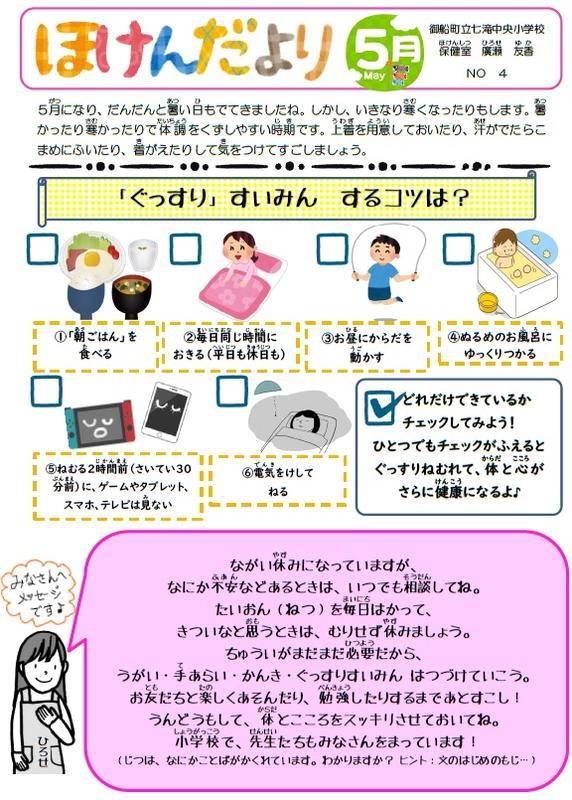 保健だよりNo4を発行しました。「ぐっすり睡眠のコツ」などが紹介されています。また、「7つのまちがいさがし」も