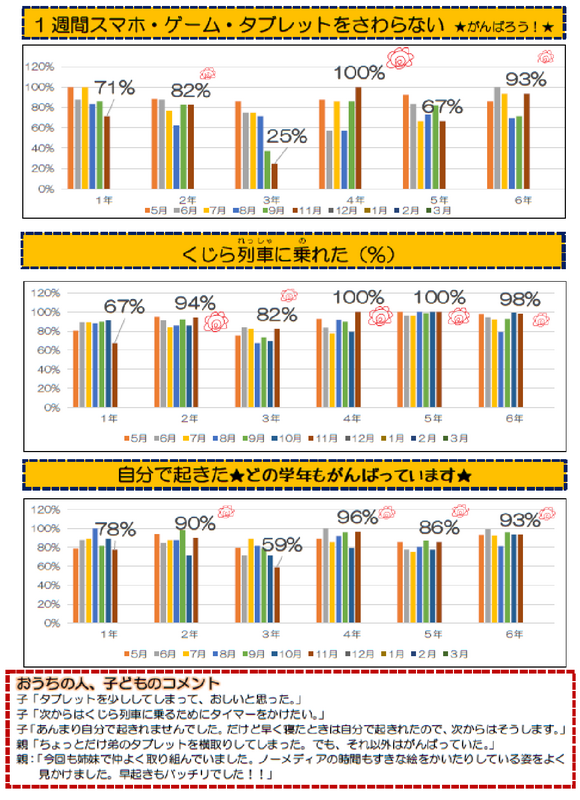 「冬休みぐっすりすいみん大作戦」では、各クラスで決めた目標に一生懸命取り組んでいることが伝わってきました運動やお手伝いをがんばりました
