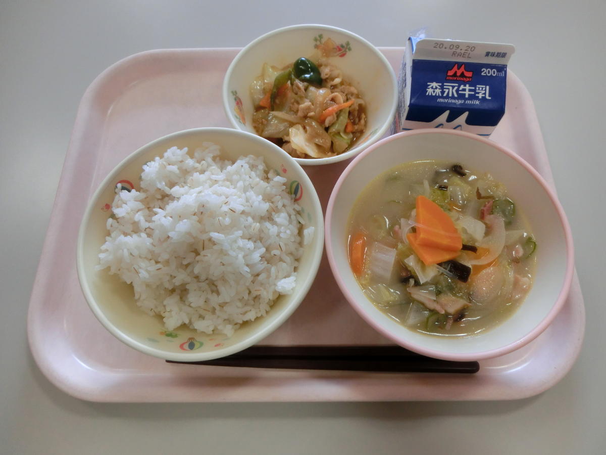 | むぎごはん たまねぎのみそしる やきにくふういため 牛乳 |