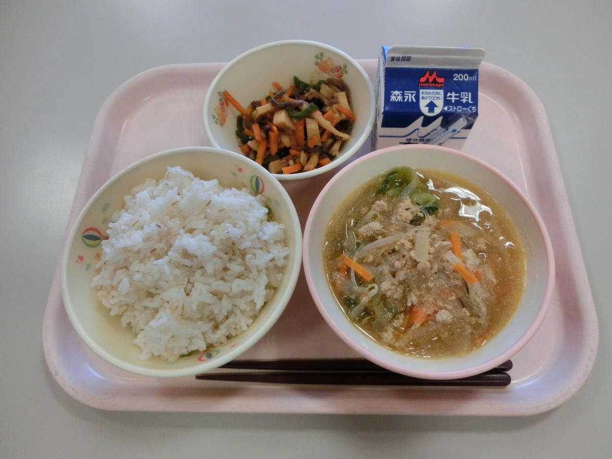 | きんぴらごはん つみれじる いわしのかんろに もやしのごまあえ 牛乳 |
