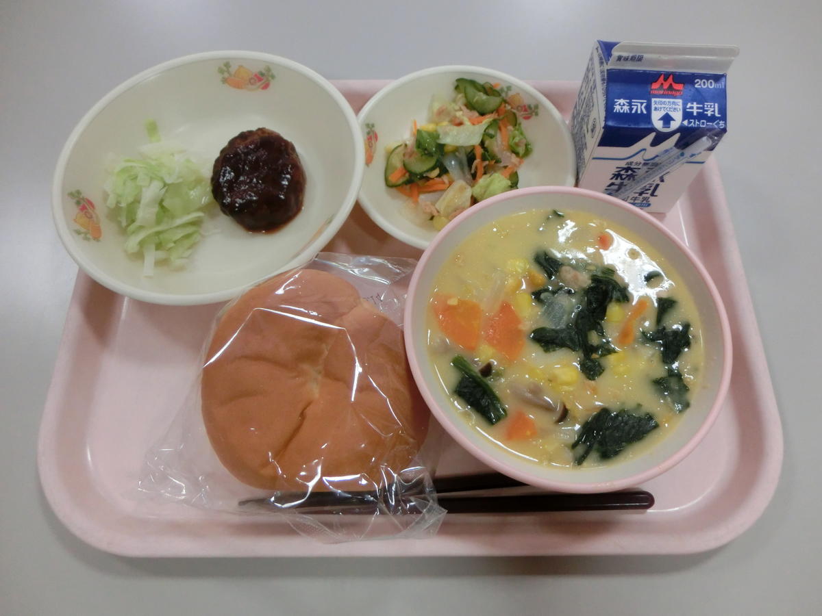 | しょくパン てづくりブルーベリージャム サラダうどん えだまめととうふのメンチカツ 牛乳 |