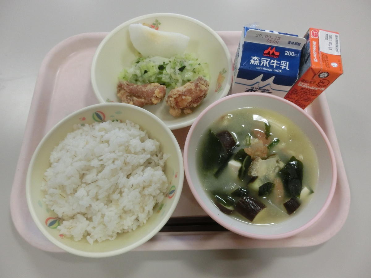 | むぎごはん なすのみそしる 天草大王のからあげ キャベツのわかめあえ なし 牛乳 |