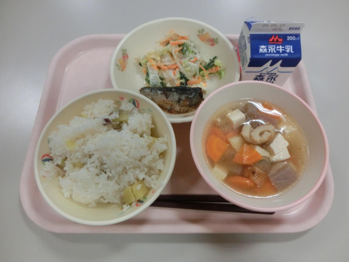 | さつまいもごはん つぼんじる いわしのかんろに こまつなのゴマネーズあえ 牛乳 |