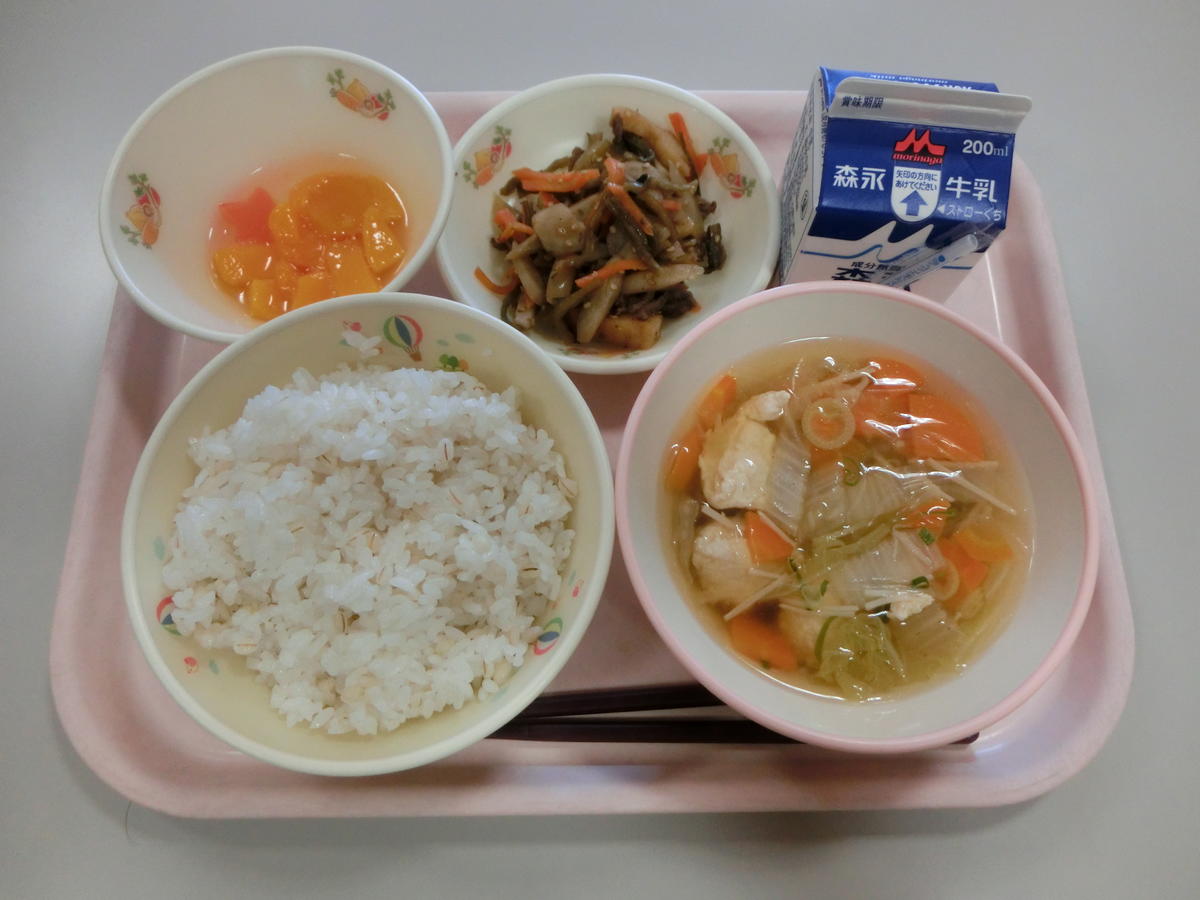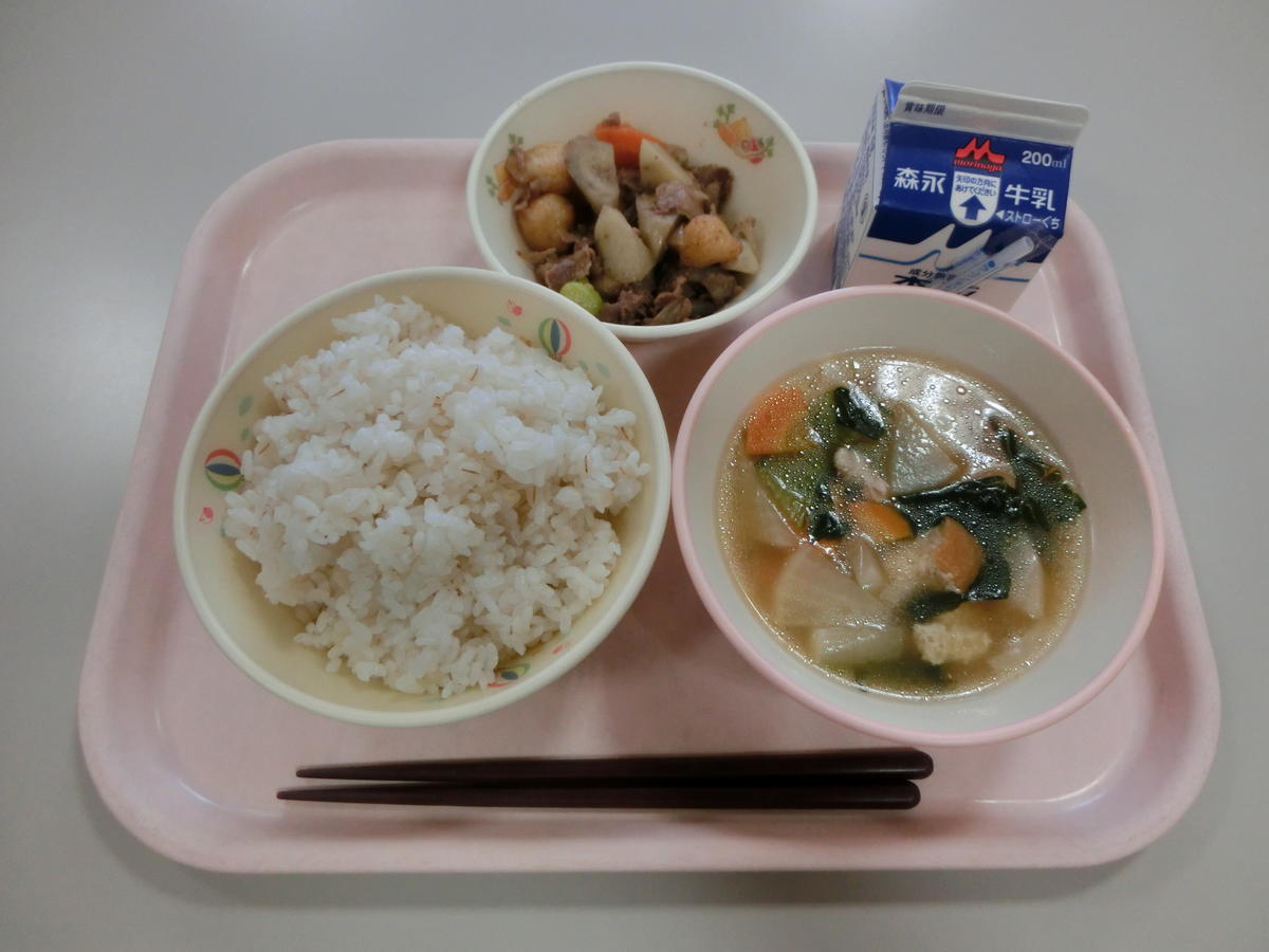 | むぎごはん しらたまじる やまいもいりとうふハンバーグ たけのこのひこずり 牛乳 |