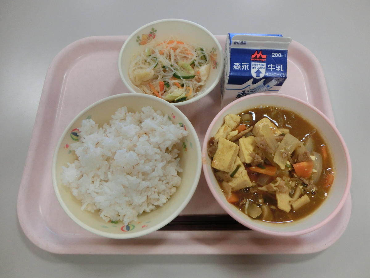 | むぎごはん カレーどうふ はるさめのごまずあえ 牛乳 |