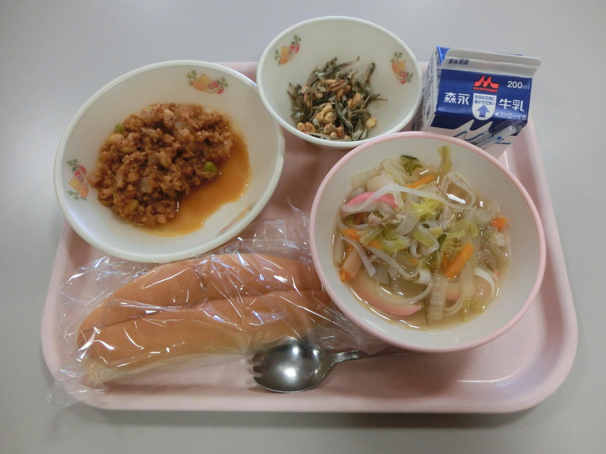 | かぼちゃパン ミートスパゲティー ごぼうとナッツのカミカミサラダ 牛乳 |
