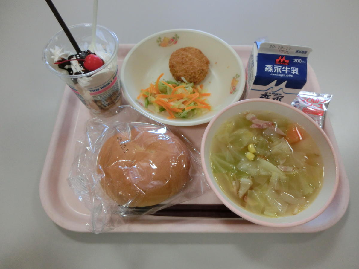 | セルフメンチカツバーガー やさいのスープに パフェ 牛乳 |