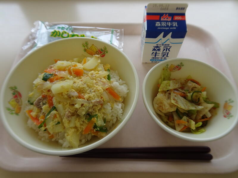 今日のメニュー:親子丼、野菜のおかかあえ、牛乳