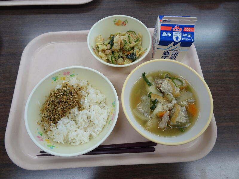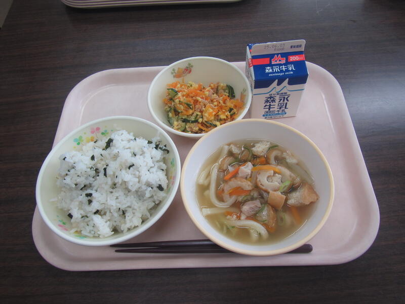 今日のメニュー :わかめごはん、きつねうどん、大根の酢の物、牛乳