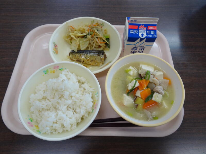 今日のメニュー:有機米入りきびご飯、豚汁、ホキてんたまあげ、野菜のおかかあえ、牛乳