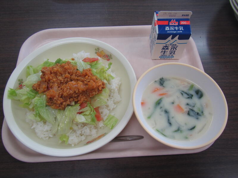 今日のメニュー:肉キャベツ丼、中華風かき玉スープ、ヨーグルト、牛乳