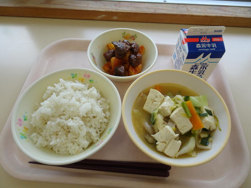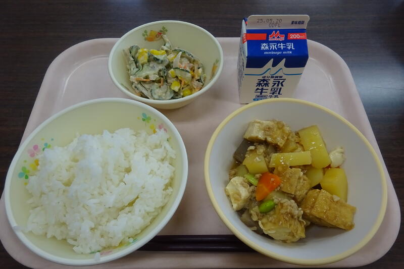 今日のメニュー :有機米ごはん、厚揚げのそぼろ煮、ごぼうのツナマヨサラダ、牛乳