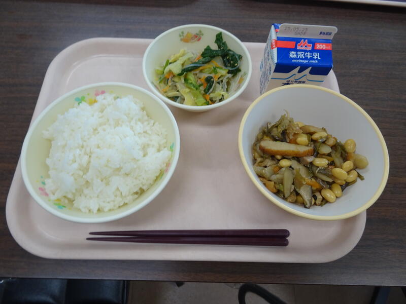 今日のメニュー:有機米ごはん、大豆の磯煮、ニラと春雨のあえ物、牛乳