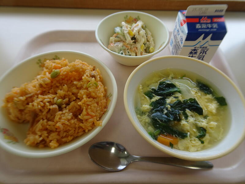 今日のメニュー:チキンライス、具だくさん卵スープ、マカロニサラダ、牛乳