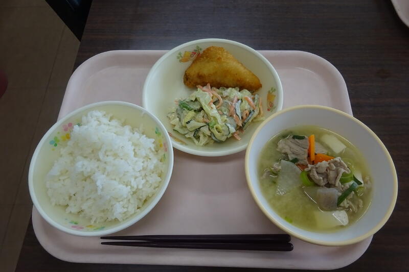 今日のメニュー :有機米ごはん、豚汁、野菜の梅マヨあえ、アジフライ、牛乳