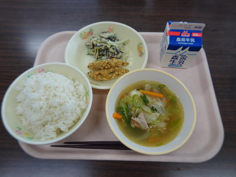 今日のメニュー:わかめごはん、根菜のごま汁、魚とレバーのナッツあえ、牛乳