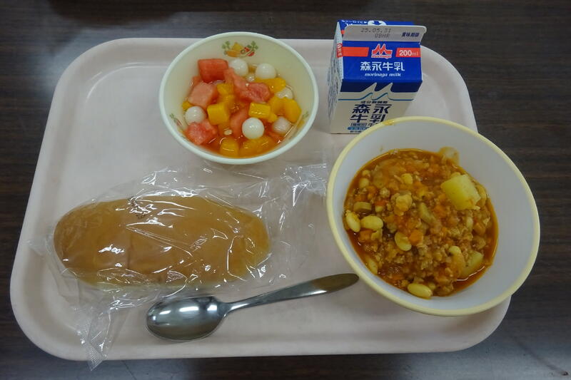 今日のメニュー :コッペパン、大豆とひき肉のトマト煮、フルーツ白玉、牛乳