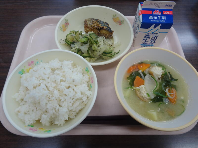 今日のメニュー :麦ごはん、じゃがいもの味噌汁、キャベツのゆかりあえ、さばのゴマダレ焼き、牛乳