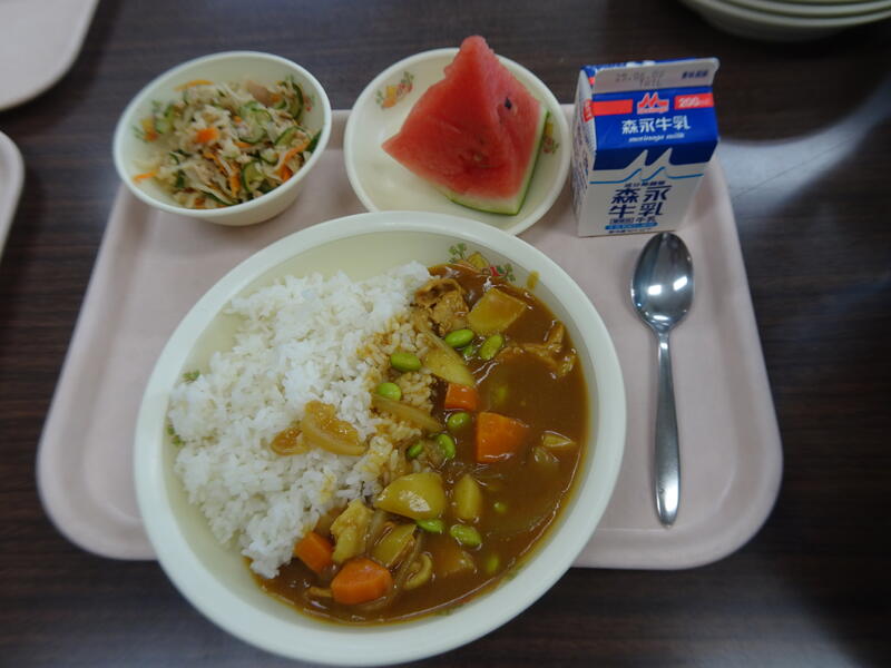 本日のお品書き:カレーライス(麦ごはん・ポークカレー)・切干大根 のサラダ・スイカ・牛乳