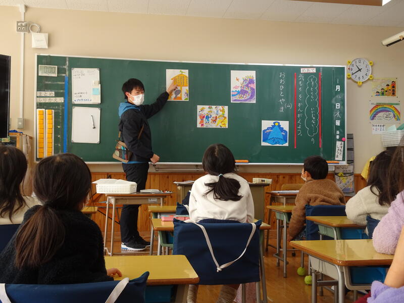 1年書写と3年書写に学校応援団が来てくださいました。1年には山下春樹さん(西部地区)、3年はに山下敏視さん、井ノ一昭代さん、中内千惠子さん(七滝地区)が入り、丸を付けたり筆の運びを誉めたりしてくださいました。子供たちは、たくさん誉めてもらって嬉しそうでした!
