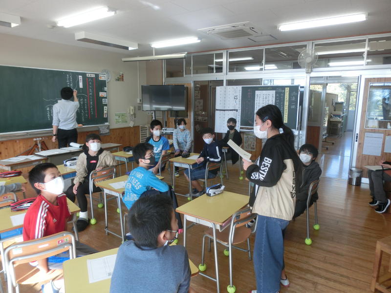 5年生は「外国語」で、友達を紹介する表現を学習していました。カードをめくって楽しく練習していました。