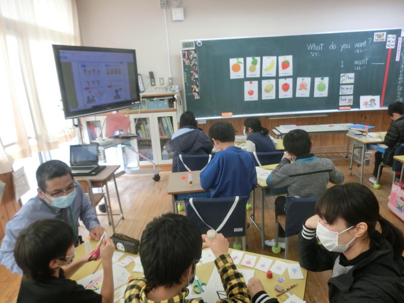 4年生は外国語の学習をしていました。「何が欲しいですか」の英語表現を練習していました。英語を使って集めたフルーツで、オリジナルのパフェを作っていました。「もっとバエ(映え)させるね!」と言って色塗りをしていました。うーん、バエてますね(^^)/