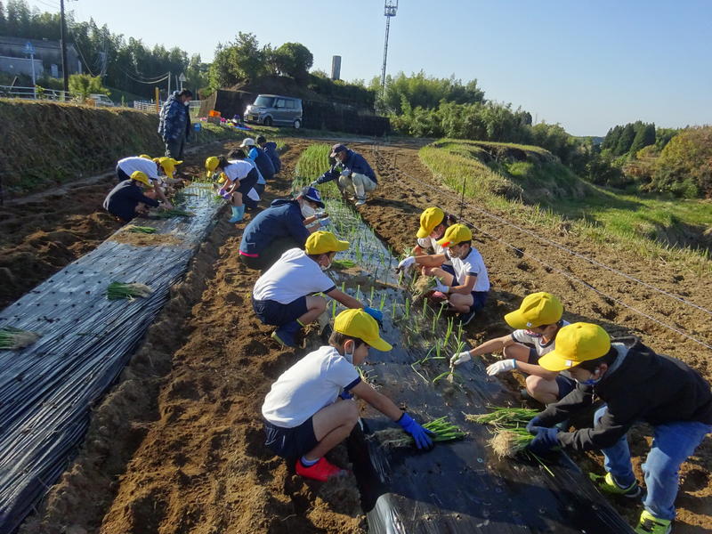 1・2年生が学校体験農園で「玉ねぎ植え」を行いました。地域の方々に植え方のご指導に来ていただき、2200本もの玉ねぎの苗を植えることができました。子供たちは大変手際よく植え、あっという間に黒いマルチの上に、緑の苗が並びました。1年生のある子は、「チェック係」を特にがんばり、1本1本「OK!OK!OK!・・・(2200回)」と指さしながらジャッジをしていました。来年6月に玉ねぎを収穫します。収穫が楽しみですね(^^)/