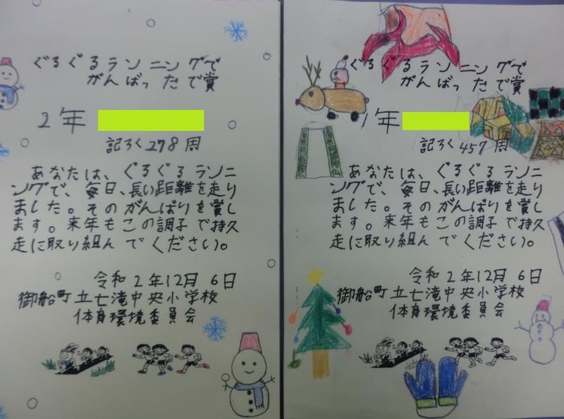 「ぐるぐるランニングで頑張ったで賞」では、体力向上のぐるぐるランニングの取組で運動場を457周も走った1年生が代表で表彰を受け、副賞に「図書室の本をプラス一冊借りられる券」をもらいました(^^)/