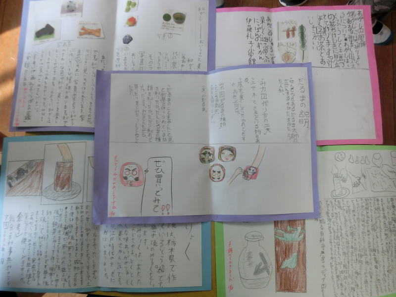 4年生は国語「日本文化を発信しよう」の学習をしていました。伝統芸能に関するリーフレットを作って発表会を行っていました。こけしやだるまなど、図やイラストを効果的に使って分かりやすいリーフレットができあがっていました(^^)/