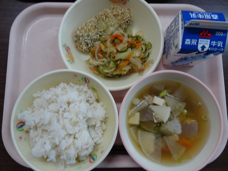 麦ご飯、牛乳、けんちん汁、ホキの天玉揚げ、野菜のごま和え