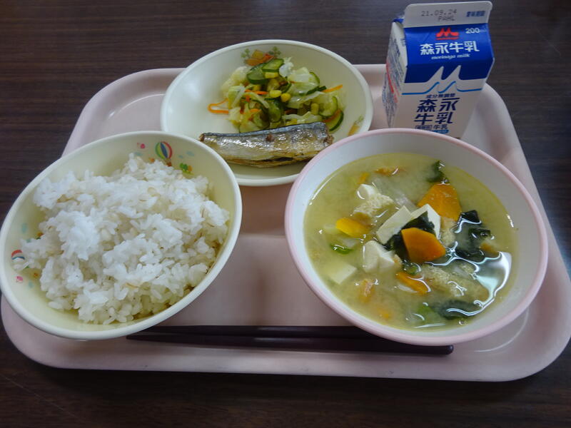 麦ご飯、牛乳、みそ汁、さんま塩焼き、かぼす和え