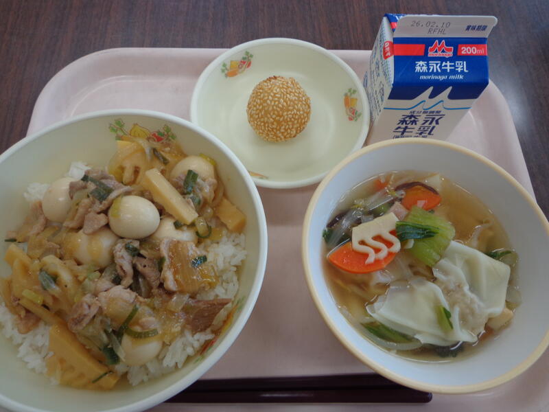今日のメニュー :ルーローハン(麦ごはん、ルーローハンの具)、ワンタンスープ、ごま団子、牛乳